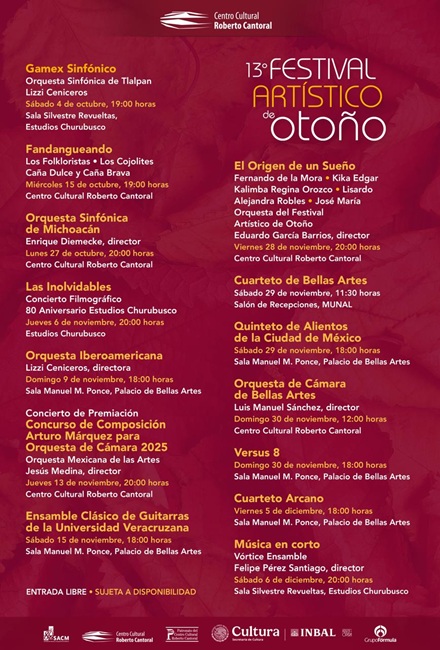 Resultado del esfuerzo conjunto de la Sociedad de Autores y Compositores de México (SACM), el Patronato del Centro Cultural Roberto Cantoral (CCRC), la Secretaría de Cultura del Gobierno de México, a través del Instituto Nacional de Bellas Artes y Literatura (INBAL), los Estudios Churubusco Azteca, la Secretaría de Cultura de Michoacán y la Universidad Veracruzana, se realizará el 13.° Festival Artístico de Otoño (FAO), del 15 de octubre al 6 de diciembre próximos.